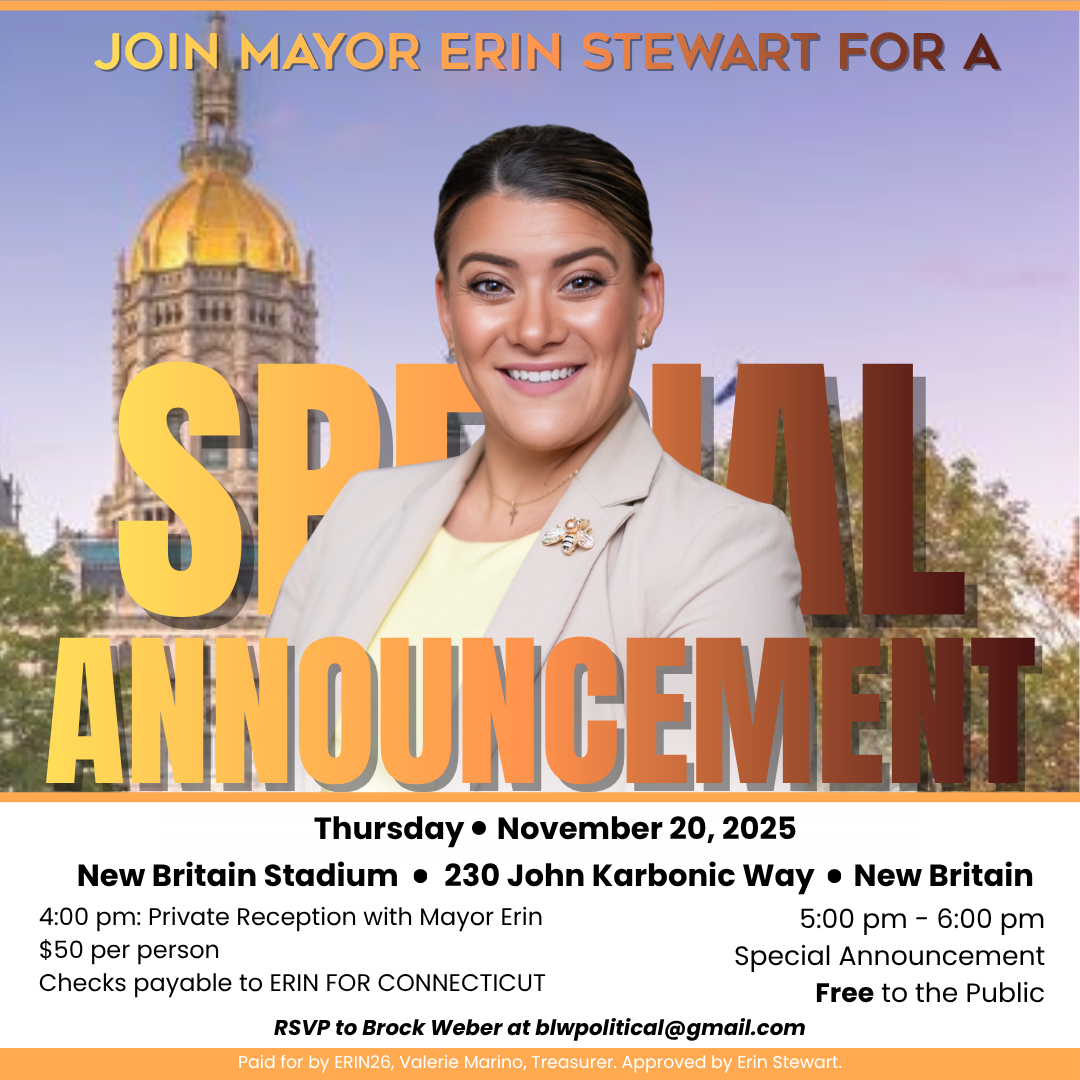New Britain Stadium 230 John Karbonic Way, New Britain, CT, United StatesJoin Mayor Erin Stewart for s a special announcement in New Britain on Thursday, November 20, 2025! 230 John Karbonic Way, New Britain, CT 06053 Private reception at 4pm, announcement at 5pm. Suggested reception contribution: $50 per person for reception Announcement is free.