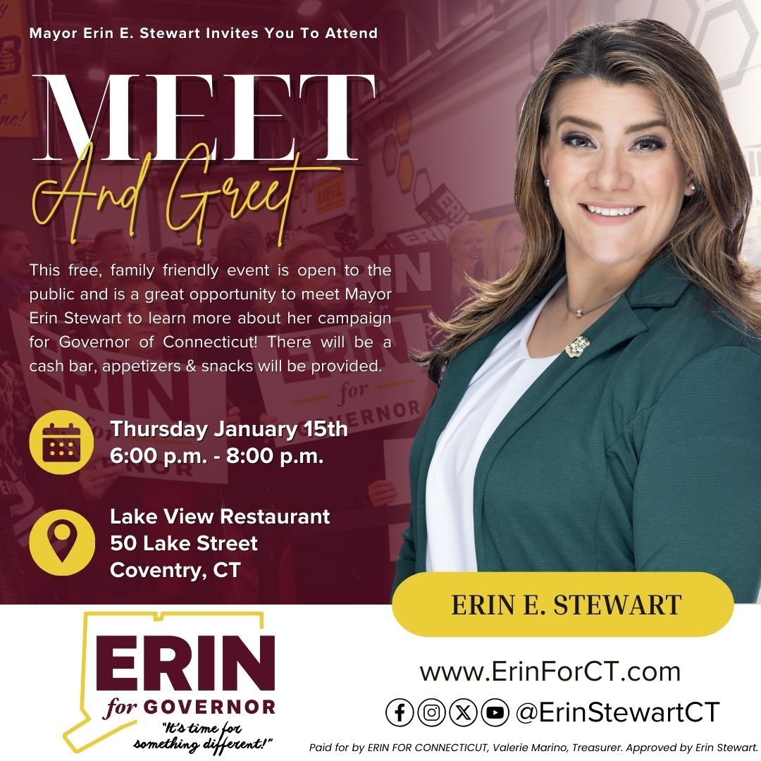 Lake View Restaurant 50 Lake Street, Coventry, CT, United StatesJOIN CTGOP GUBERNATORIAL CANDIDATE ERIN STEWART FOR: A MEET AND GREET This FREE, family friendly event is open to the public and is a great opportunity to talk with Mayor Erin Stewart about her campaign for Governor. Cash Bar and snacks will be provided. RSVP: gregg@erinforct.com